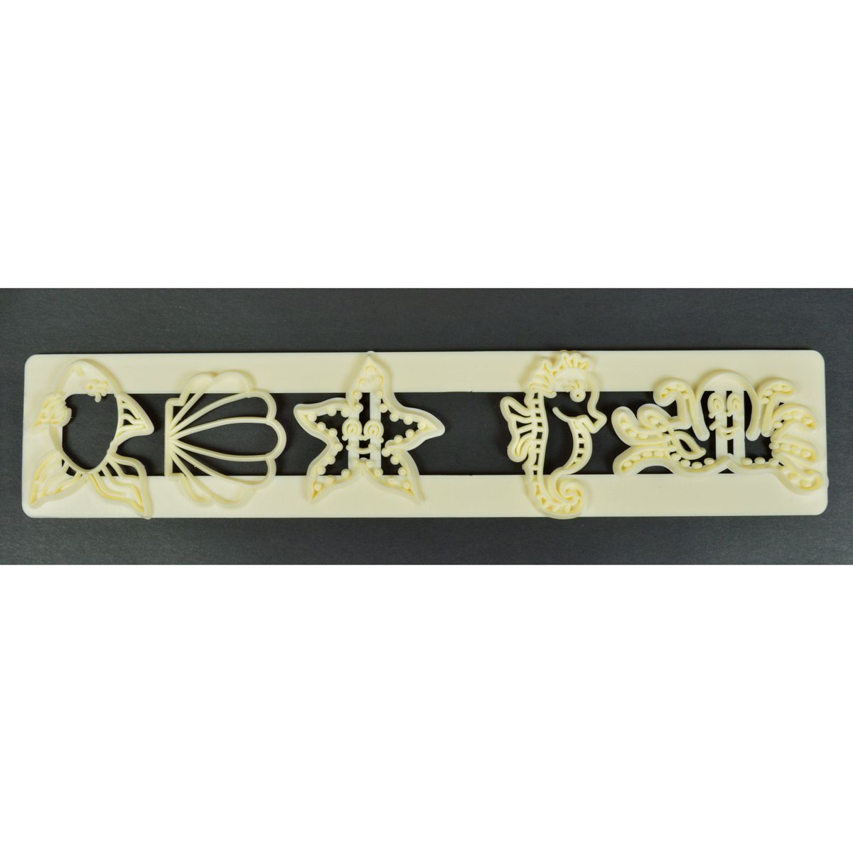 FMM Figure Sottomarine Dettagli Fai vivere il mondo sottomarino sulle tue torte e cupcakes con il Tappit con Motivi Sottomarini di FMM. Questo tappit contiene una stella marina, cavalluccio marino, pesce, polipo e conchiglia. Il tappit è perfetto da usare per una torta per il compleanno di un bambino o addirittura una torta nuziale col tema della spiaggia. Consiglio: combina questo tappit con il Set/2 pezzi di Tagliapasta con Code di Sirena di FMM. Questo tagliapasta funziona al meglio se impasti bene il marzapane o fondante (mischiati con un po’ di cmc) e dopodichè stendi in modo molto sottile. Ritagliare la lettera desiderata e dopodichè picchiettarla ed estrarla dal righello. Il tagliapasta è fatto di plastica alimentare sicura ed ha bordi affilati ma lisci. Dimensione: circa 5 - 6 cm. Contenuto: 1 tagliapasta a forma di righello. | |